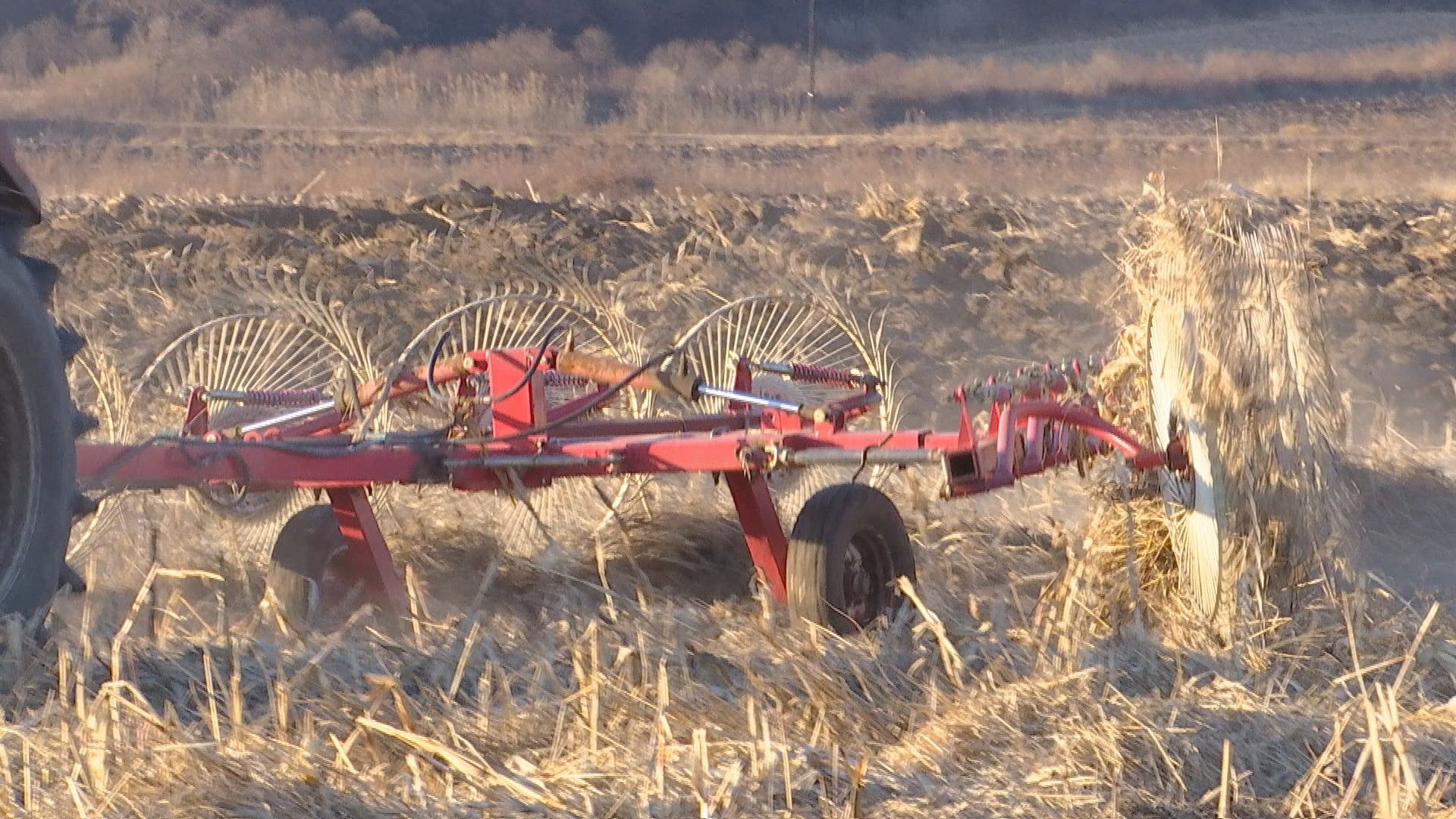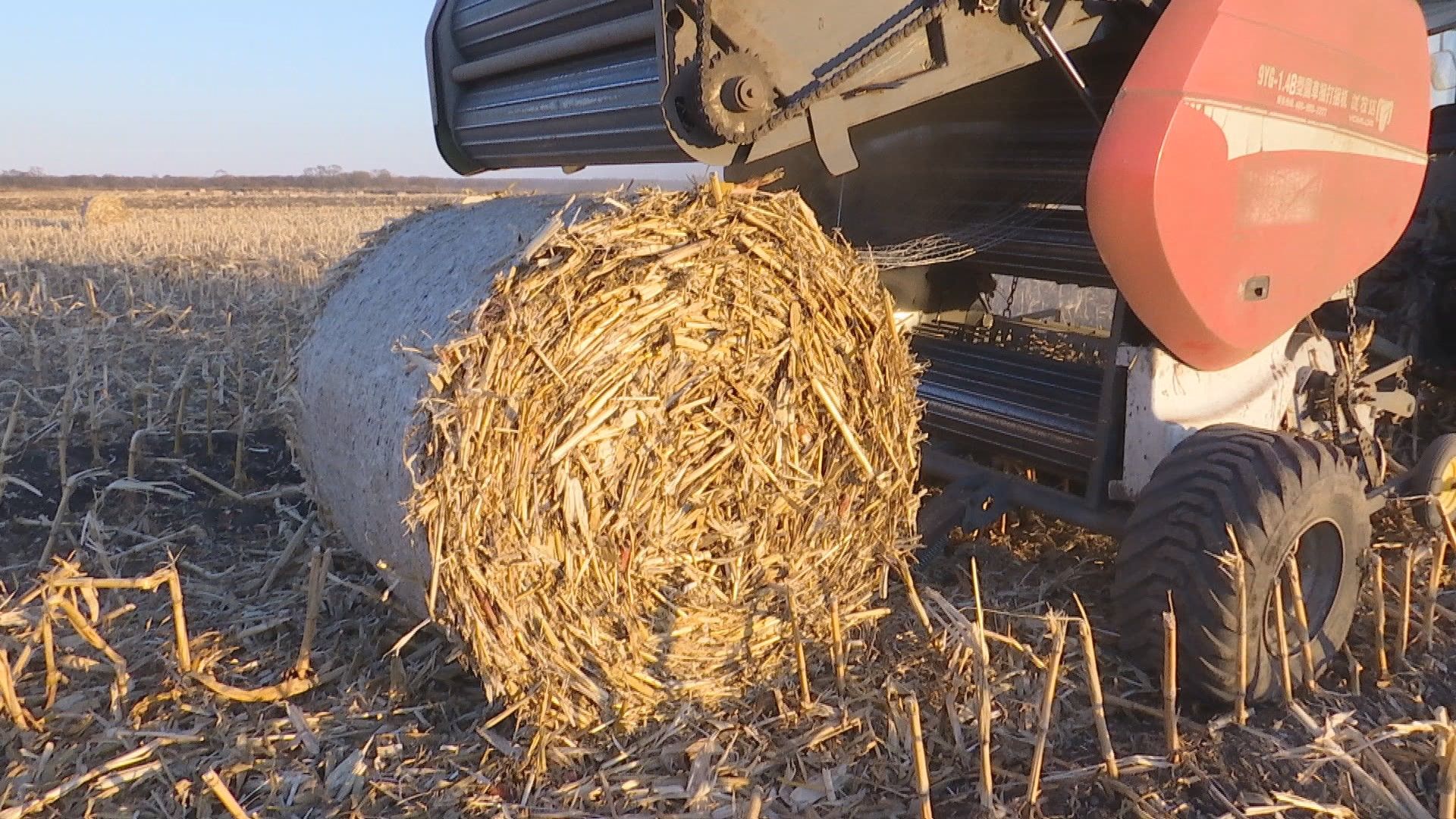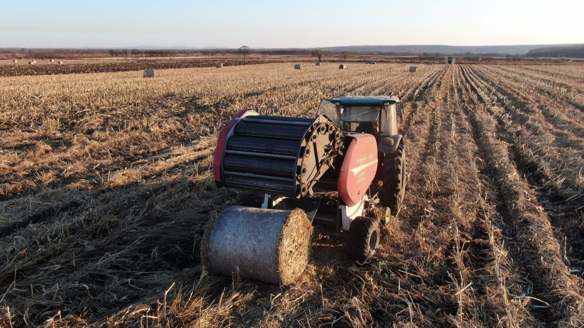在向阳乡良种厂,秸秆搂草机、秸秆打捆机在田间来回穿梭,搂草机将田间秸秆归拢成一条线,随后打捆机将归拢到一起的秸秆快速回收、压实、打捆,从车后滚落,很快,田间出现一排排秸秆包。