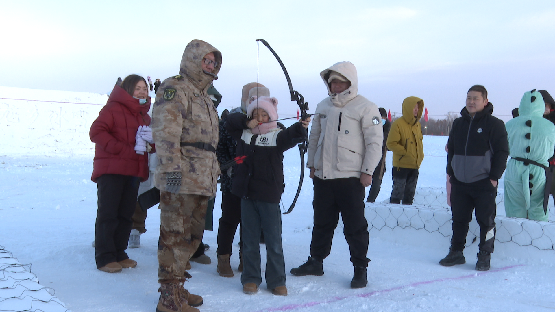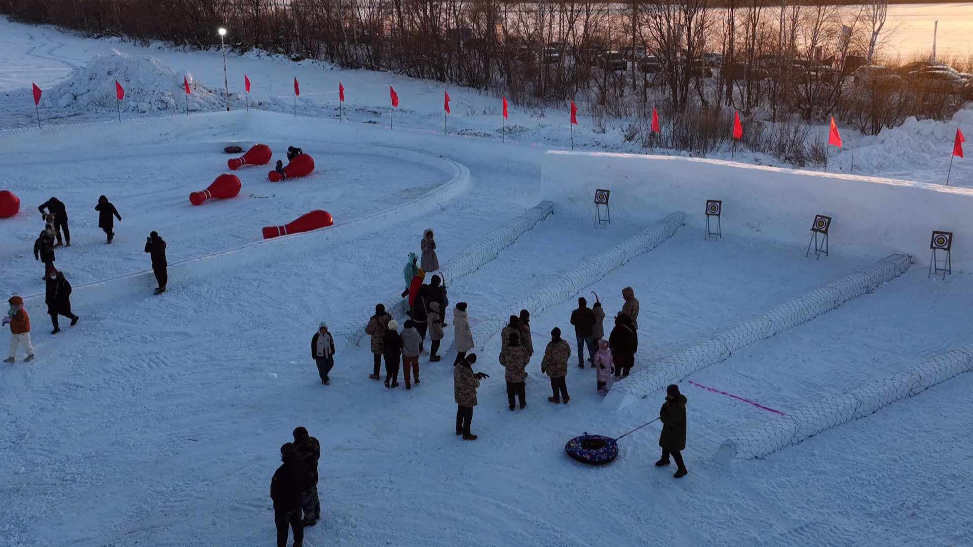 拉弓、瞄准、脱弦……离弦的箭直奔靶心,雪地射箭项目引来不少人的观看,大家纷纷拿起弓箭小试牛刀。而另一边,雪地保龄球也显得颇为有趣,大家坐在雪圈上,从滑道缓慢而下,朝着一堆保龄球前进,有百发百中的,也有偏离轨道的,体验感满满。