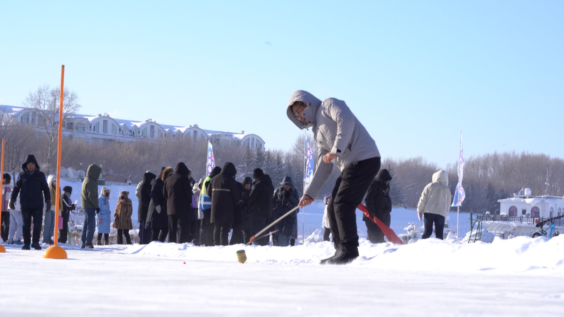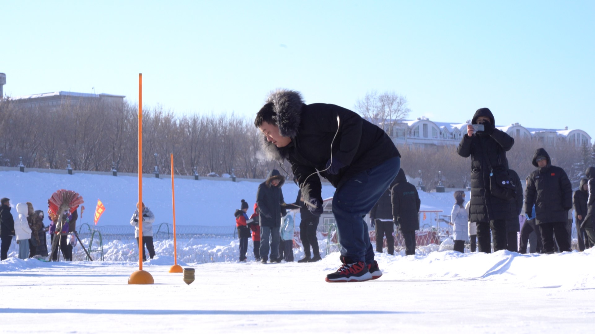 随着活动的开始,青少年选手们来到冰上抽起冰尜,让寂静的江畔瞬间变得喧嚣而活跃起来。别看他们年纪不大,抽尜的技术可是炉火纯青。无论是单手打还是双手循环来回反转,动作都十分娴熟。手里的尜鞭在空中啪啪作响,落在尜上更是清脆。赛场外,加油声、呐喊声此起彼伏。大家沉浸在冰雪世界里惬意畅玩,开启了一场冰上狂欢。