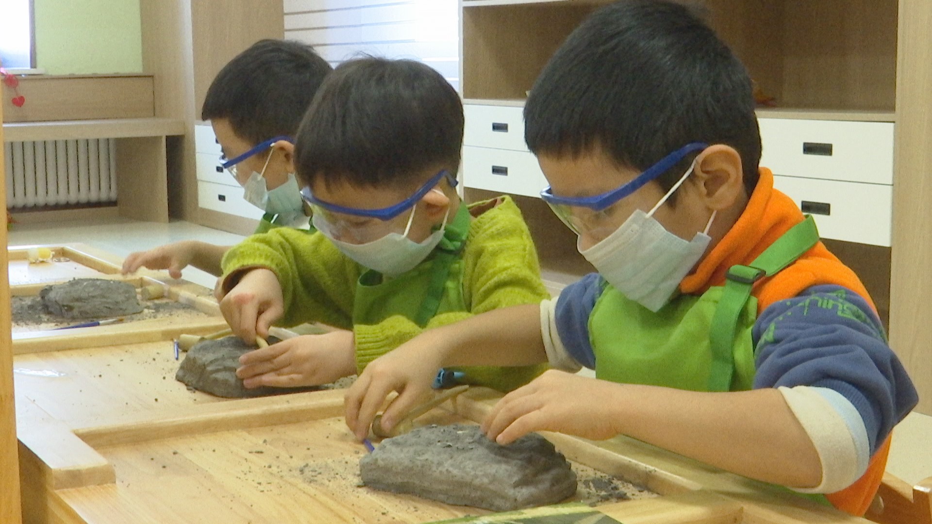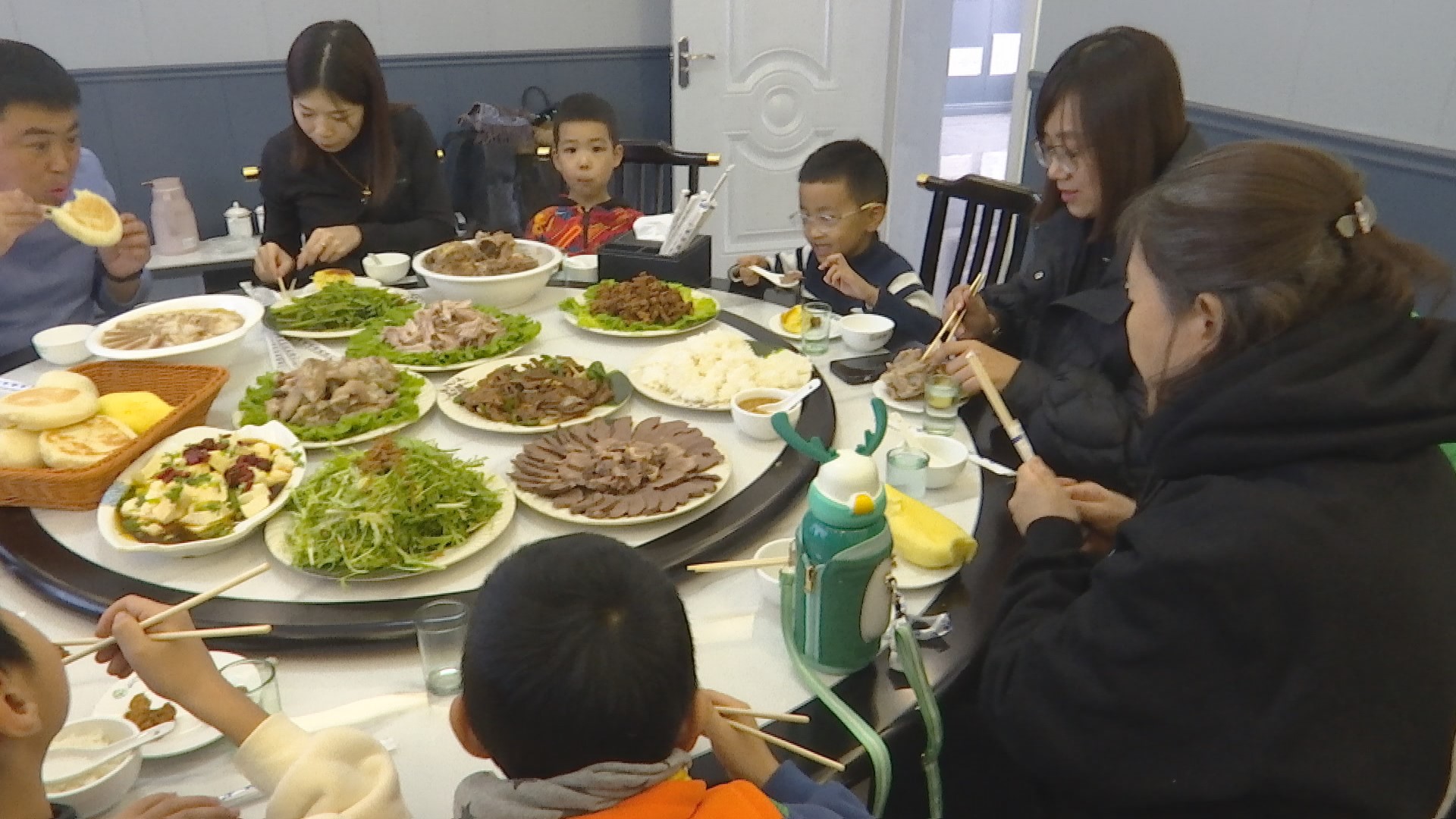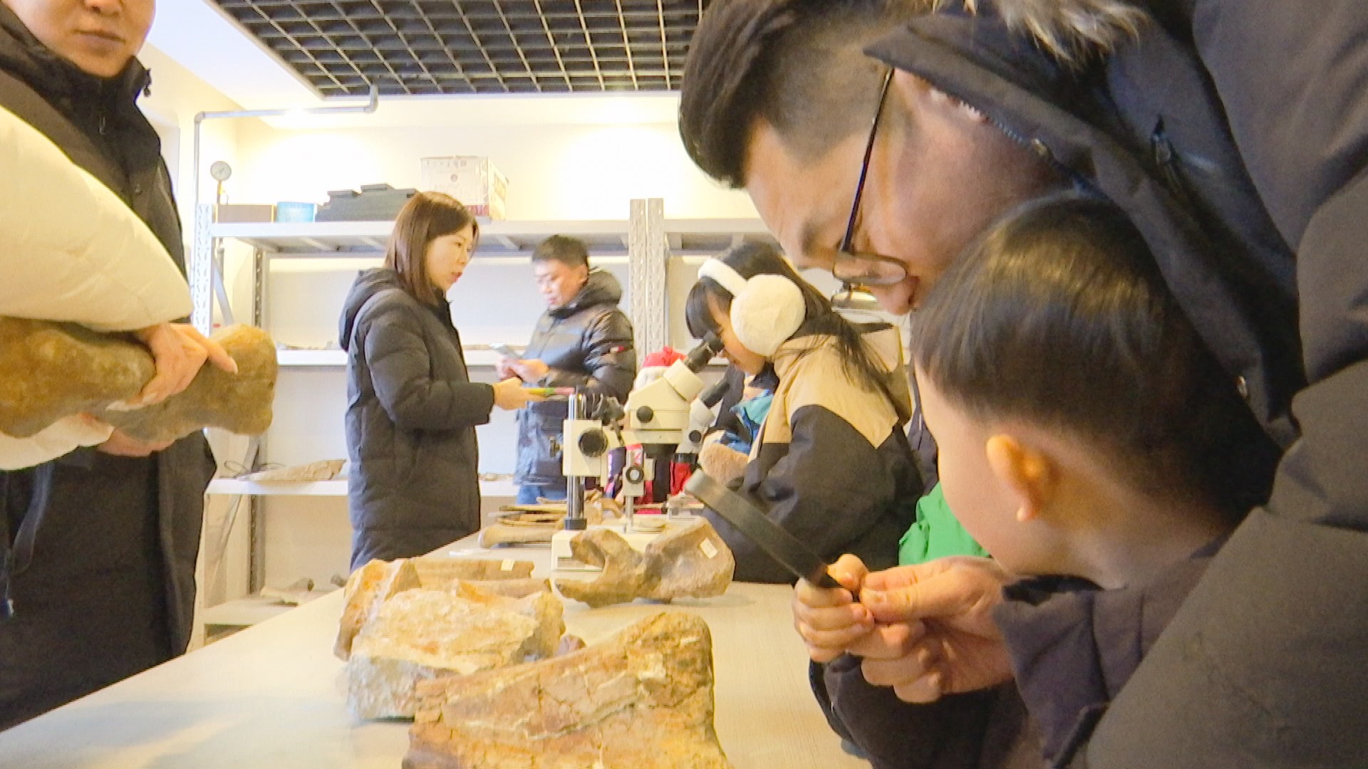 在红光乡燎原村龙韵悠阁民宿,研学团的孩子们就被民宿大院形态各异的恐龙雕塑吸引,在雪地里嬉戏打闹。孩子们在品尝农家杀猪菜后,正式进入了“研学模式”。